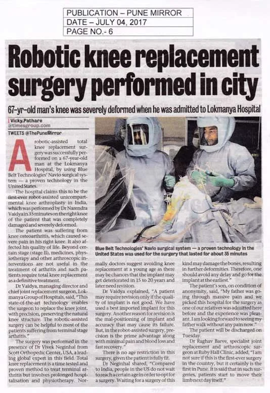 A robotic-assisted knee replacement surgery was successfully performed on a 67-year-old man at the Lokmanya Hospital, by using Blue Belt Technologies' Navio surgical system-a proven technology in the United States. The hospital claims this is to be the first-ever robotic-assisted unicompartmental knee arthroplasty in India which was performed by Dr. Narendra Vaidhya in 35 minutes on the right knee of the patient that was completely damaged and severely deformed.